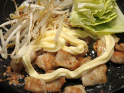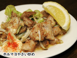 塩ホルモンを野菜と炒め、焼き上がりの少し前にマヨネーズを加え軽く炒めて出来上がり。