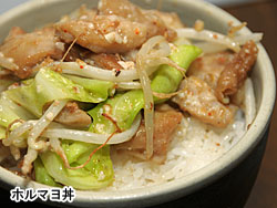 ホルマヨ炒めをご飯に乗せると「ホルマヨ丼」の出来上がり。ご飯に乗せる場合は、マヨネーズ多めにしフライパンから上げる前の仕上げに醤油をたらすと、更にご飯によく合います。ホルモンのタレが溶けたマヨネーズがご飯にしみ込んでご飯が進む一品の出来上がりです。