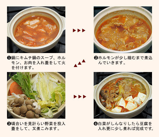 お肉とホルモンを先にキムチ鍋のスープで煮込むことでうま味と辛味をなじませます。ホルモンを半分焼き出来あがりで加えると香ばしさもプラスされるので更におススメ。